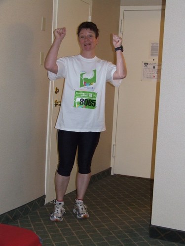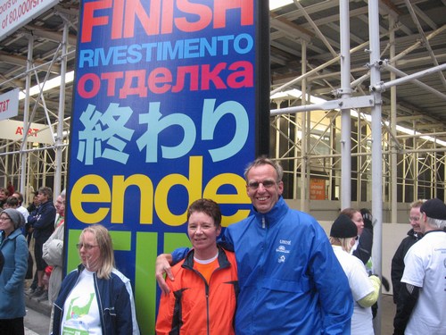 De pasta lieten we ons goed smaken aan een tafel met een aantal italianen en een paar amerikanen. Nadat we het eten ophadden direkt maar weer naar de uitgang om weer plaats te maken voor andere hardlopers. Bij de uitgang kregen we nog koekjes, appels, ijs en pasta in droge vorm om thuis klaar te maken. Het viel allemaal dus mee. Weer in het hotel aangekomen de kleding en andere artikelen klaargelegd voor marathonday. Het startnummer opgespeld en de tekst 'Smitty' voor de aanmoedigingen onderweg. Nu maar kijken of dat werkt.