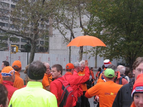 lopers verlaten het parcours en gaan met de doedelzakspelers op